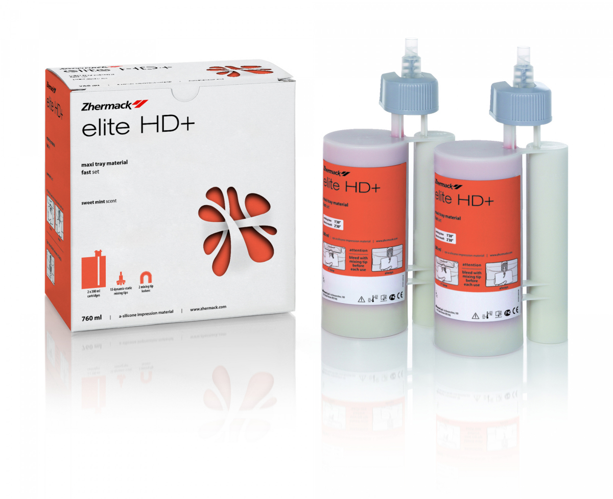 ELITE HD+ MAXI Silicone di tipo A, confezionato nel sistema per la miscelazione automatica in rapporto 5:1. Confezione Ricambio: 2 cartucce da 380 ml + 15 puntali dinamici + 2 blocca puntali HD+ Maxi Tray Material - alta viscosità (per tecnica simultanea con due viscosità)