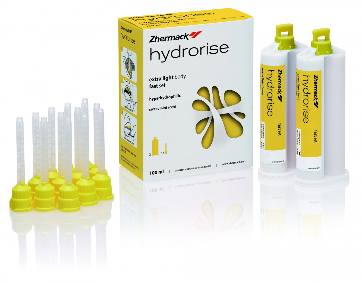 Silicone di tipo A che si adatta a qualsiasi tecnica d'impronta anche in situazioni cliniche complesse. Alcune delle caratteristiche principali a seguire. Iperidrofilia: la tecnologia esclusiva sviluppata dalla ricerca Zhermack rende Hydrorise estremamente affine all'acqua; angolo di contatto inferiore a 10°:minore è l'angolo di contatto, maggiore è la bagnabilità del materiale, permettendo al silicone di adattarsialle diverse morfologie dental; Sistema AMDA (Advanced Moisture Displacement Action): favorisce una precisa riproduzione dei dettagli nell'ambiente umido della bocca, preservando l'integrità dei margini dell'impronta. Confezione: 2 cartucce da 50 ml + 12 puntali di miscelazione gialli