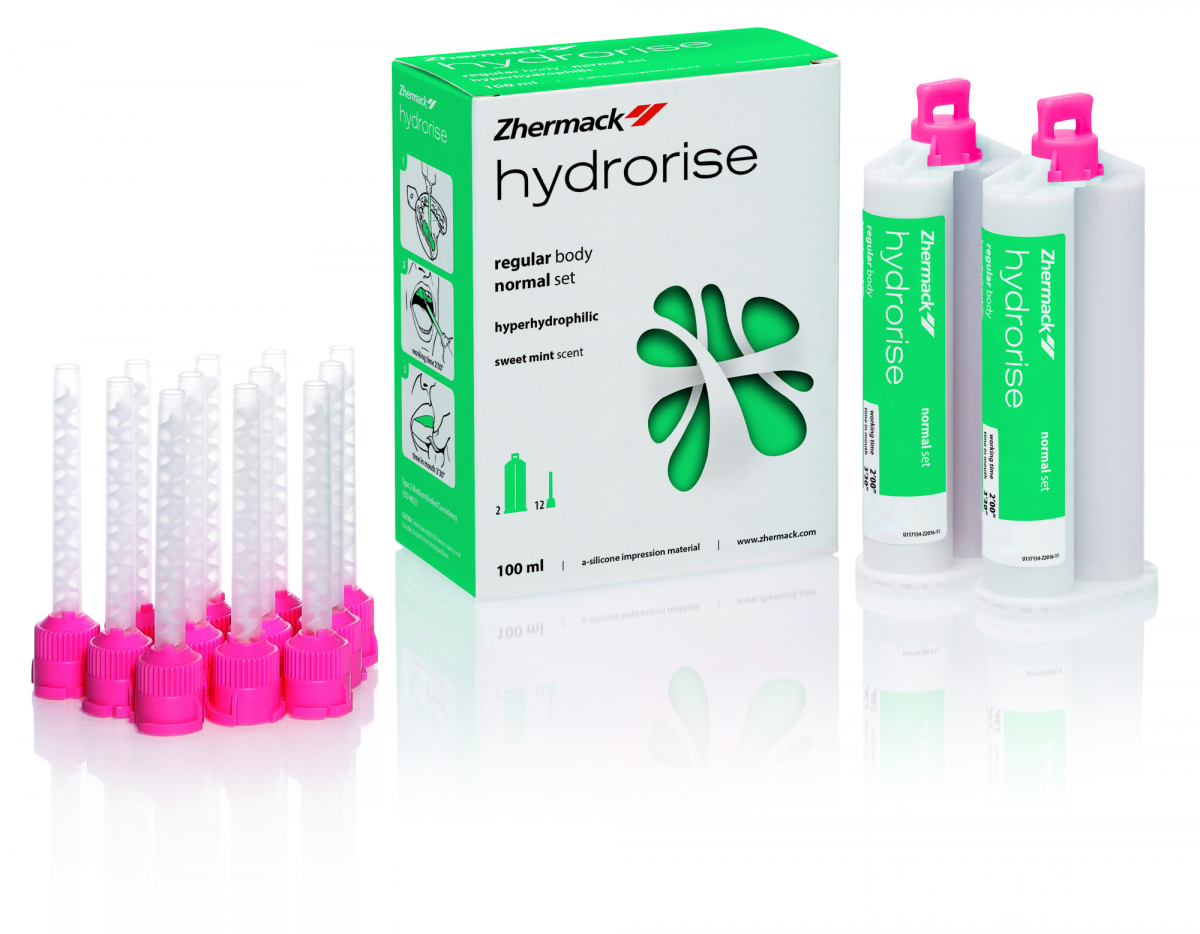 Silicone di tipo A che si adatta a qualsiasi tecnica d'impronta anche in situazioni cliniche complesse. Alcune delle caratteristiche principali a seguire. Iperidrofilia: la tecnologia esclusiva sviluppata dalla ricerca Zhermack rende Hydrorise estremamente affine all'acqua; angolo di contatto inferiore a 10°:minore è l'angolo di contatto, maggiore è la bagnabilità del materiale, permettendo al silicone di adattarsialle diverse morfologie dental; Sistema AMDA (Advanced Moisture Displacement Action): favorisce una precisa riproduzione dei dettagli nell'ambiente umido della bocca, preservando l'integrità dei margini dell'impronta. Confezione: 2 cartucce da 50 ml + 12 puntali di miscelazione gialli