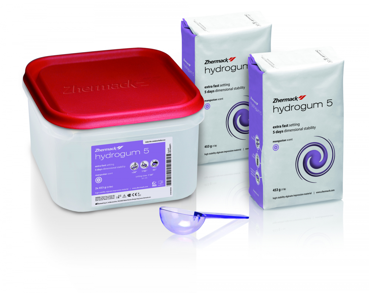 HYDROGUM 5 Alginato tissotropico, dalla formula innovativa che rende più rapido l' assorbimento dell'acqua e conferisce all'impasto cremosità e scorrevolezza elevate. La stabilità dimensionale è di 5 giorni; è infatti possibile colare il modello anche dopo 120 ore, con una variazione dimensionale dello 0,5%. Barattolo da 2 buste da 453 gr cad. + misurino