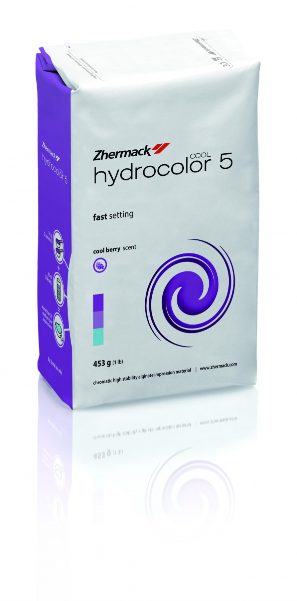 HYDROCOLOR 5 Alginato a presa rapida, a viraggio cromatico a tre fasi: la fase fucsia identifica il tempo di miscelazione, la fase viola indica il tempo di lavorazione e la fase azzurra indica la fase di inserimento in bocca. Lunghissima conservabilità delle impronte (5 giorni di stabilità dimensionale). Aroma frutti di bosco (effetto rinfrescante). Busta da 453 gr