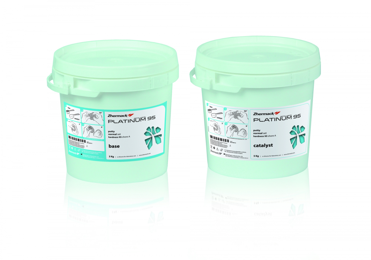 PLATINUM 95 Silicone per addizione ad elevata precisione, indicato per tecnica dello stampaggio della ceramica, controstampo in protesi totale, mascherine di controllo per la progettazione della struttura metallica, riparazione di protesi removibili, chiave di registrazione occlusale per il posizionamento in articolatore, mascherine per l'esecuzione di manufatti protesici provvisori, supporto per la lavorazione di resine composite fotopolimerizzabili. Durezza finale: 95 Shore-A. Colore Azzurro. Confezione: 1 barattolo da 1 Kg di base + 1 barattolo da 1 Kg di catalizzatore.