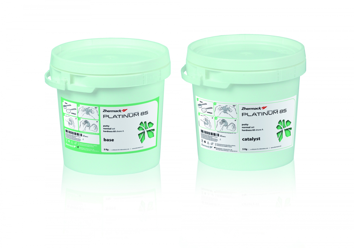 PLATINUM 85 Silicone per addizione ad elevata precisione, indicato per controstampo in protesi totale, mascherine di controllo per la progettazione della struttura metallica, supporto per la lavorazione di materiali estetici privi di metallo, mascherine per la zeppatura della protesi combinata, mascherine per l'esecuzione di manufatti protesici provvisori, mascherine per riproduzioni di maschere gengivali removibili. Durezza finale: 85 Shore-A. Colore Verde. Confezione: 1 barattolo da 5 Kg di base + 1 barattolo da 5 Kg di catalizzatore.