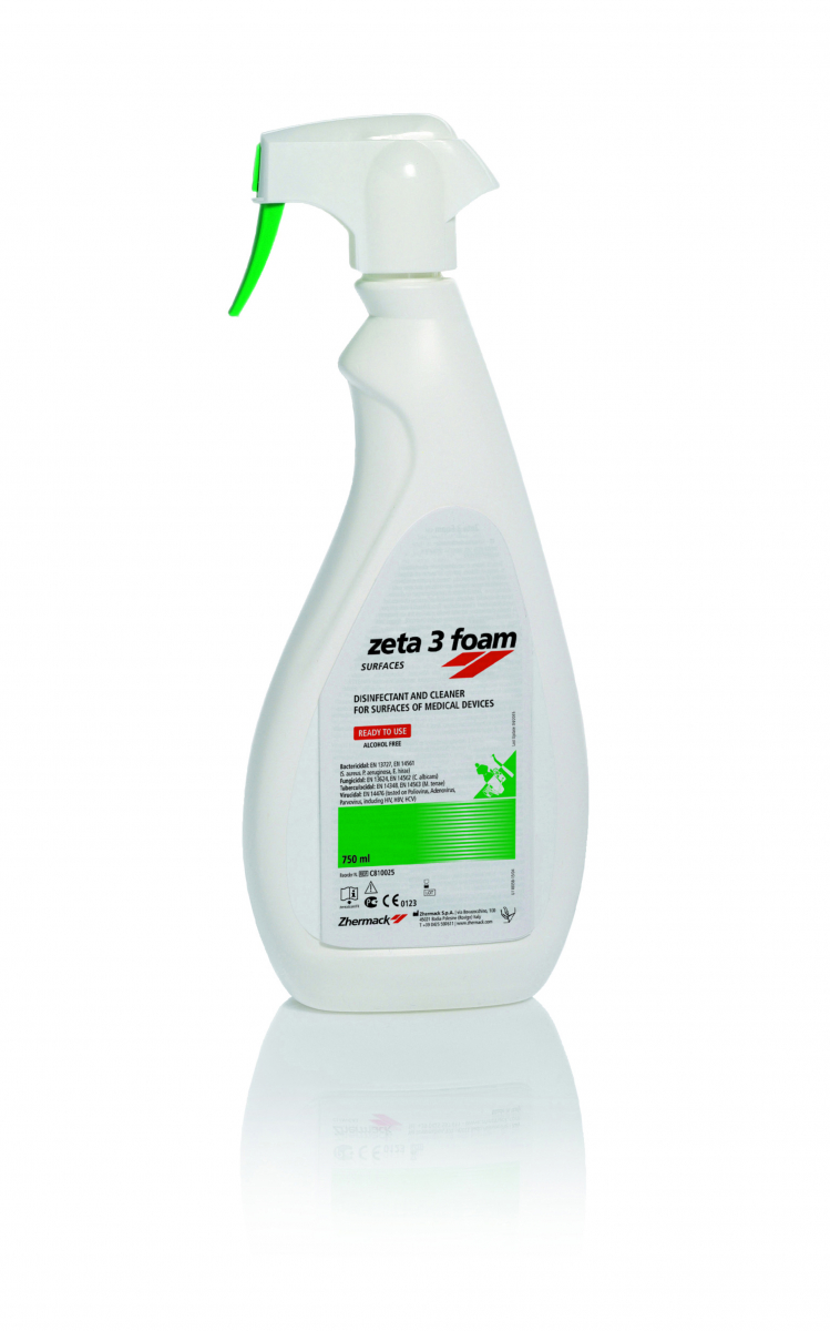 Schiuma detergente e disinfettante, pronta all'uso, contenente dimetil ammonio cloruro (0,3%), senza aldeidi e senza alcol, ad ampio spettro d'azione, indicata per la disinfezione ad alto livello tra un paziente e l'altro di superfici delicate e dispositivi medici. Svolge un'efficace azione battericida, fungicida, tubercolicida e virucida (inclusi HIV, HBV, HCV). Flacone da 750 ml con nebulizzatore
