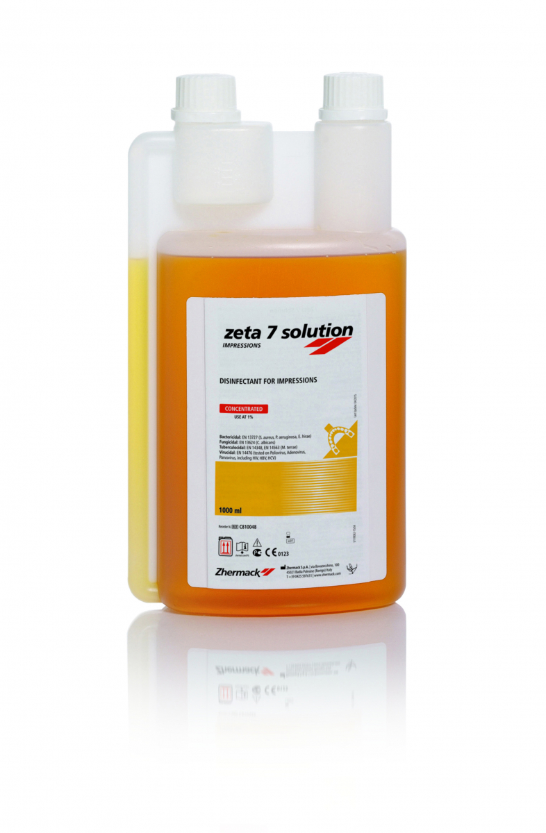 Disinfettante concentrato liquido, a base di ammonio cloruro e fenossietanolo, senza aldeidi, ad ampio spettro d'azione, per la rapida disinfezione di impronte in silicone, alginato, polietere e polisolfuro. Svolge un'efficace azione battericida, fungicida, tubercolicida e virucida (inclusi HIV, HBV, HCV, Poliovirus, Adenovirus, Parvovirus). Diluizione: 1%. Flacone da 1 Lt