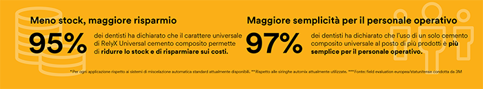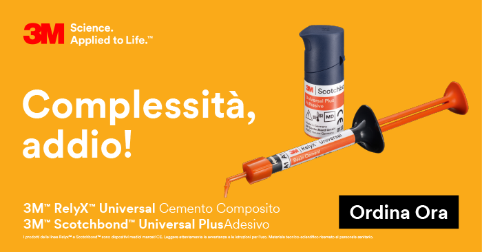 I prodotti delle linee Relyx™ e Scotchbond™ sono dispositivi medici marcati CE. Leggere attentamente le avvertenze e le istruzioni per l’uso. Materiale tecnico-scientifico riservato al personale sanitario. 3M, RelyX e Scotchbond sono marchi di fabbrica di 3M o 3M Deutschland GmbH. Utilizzati su licenza in Canada. Tutti gli altri marchi di fabbrica sono di proprietà di altre società. © 3M 2020. Tutti i diritti riservati |